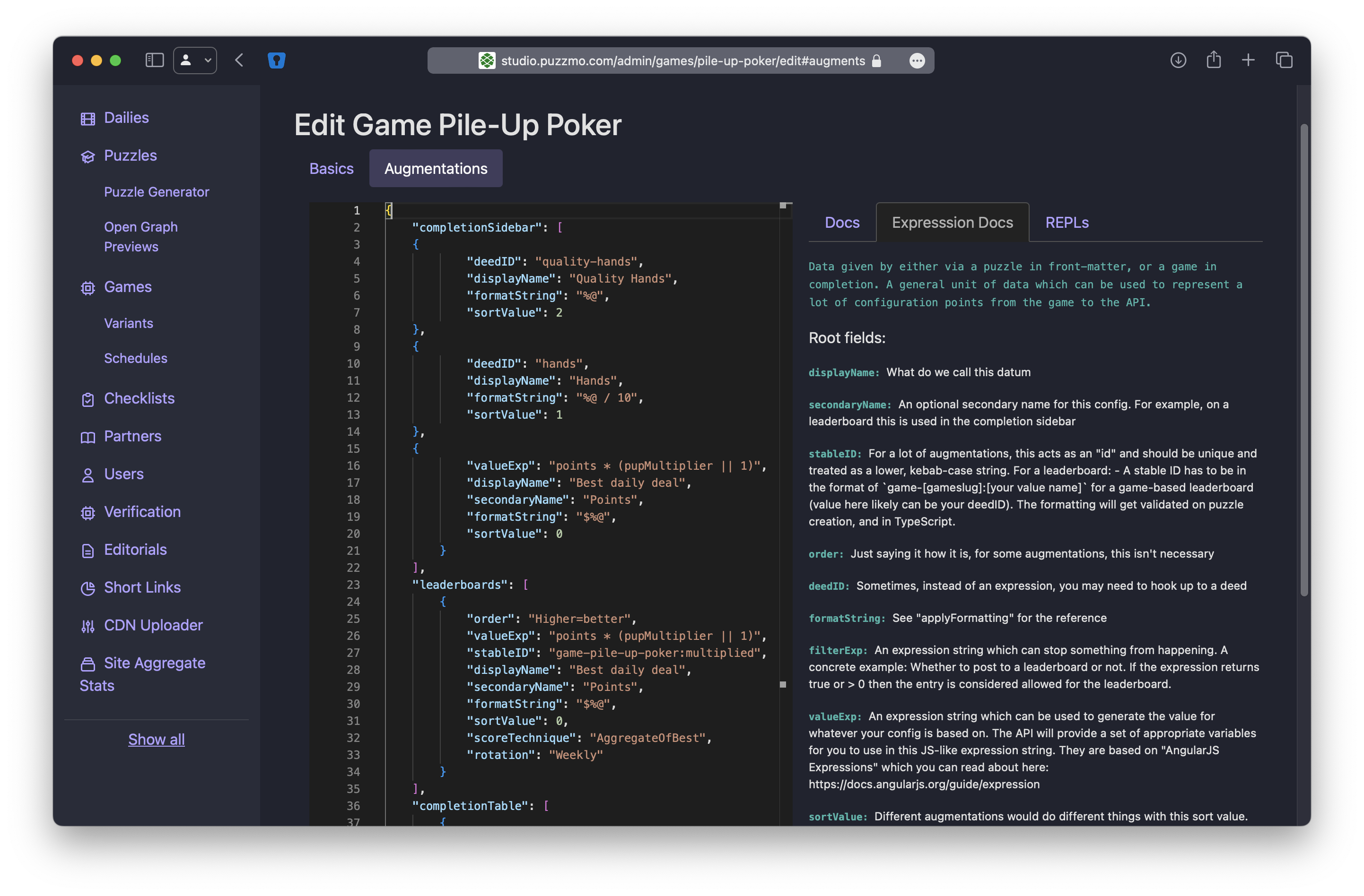 Now we have an array of augmentation configs, what to do now? Let’s look at an example expression config for a leaderboard from Spelltower: