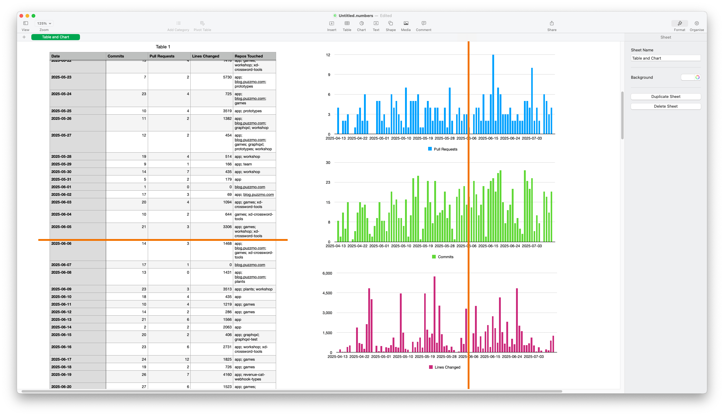 This is a 3 month chart, with a month of post-Claude Code. I just asked it to make a script to generate a CSV from looking at repos on my harddrive.